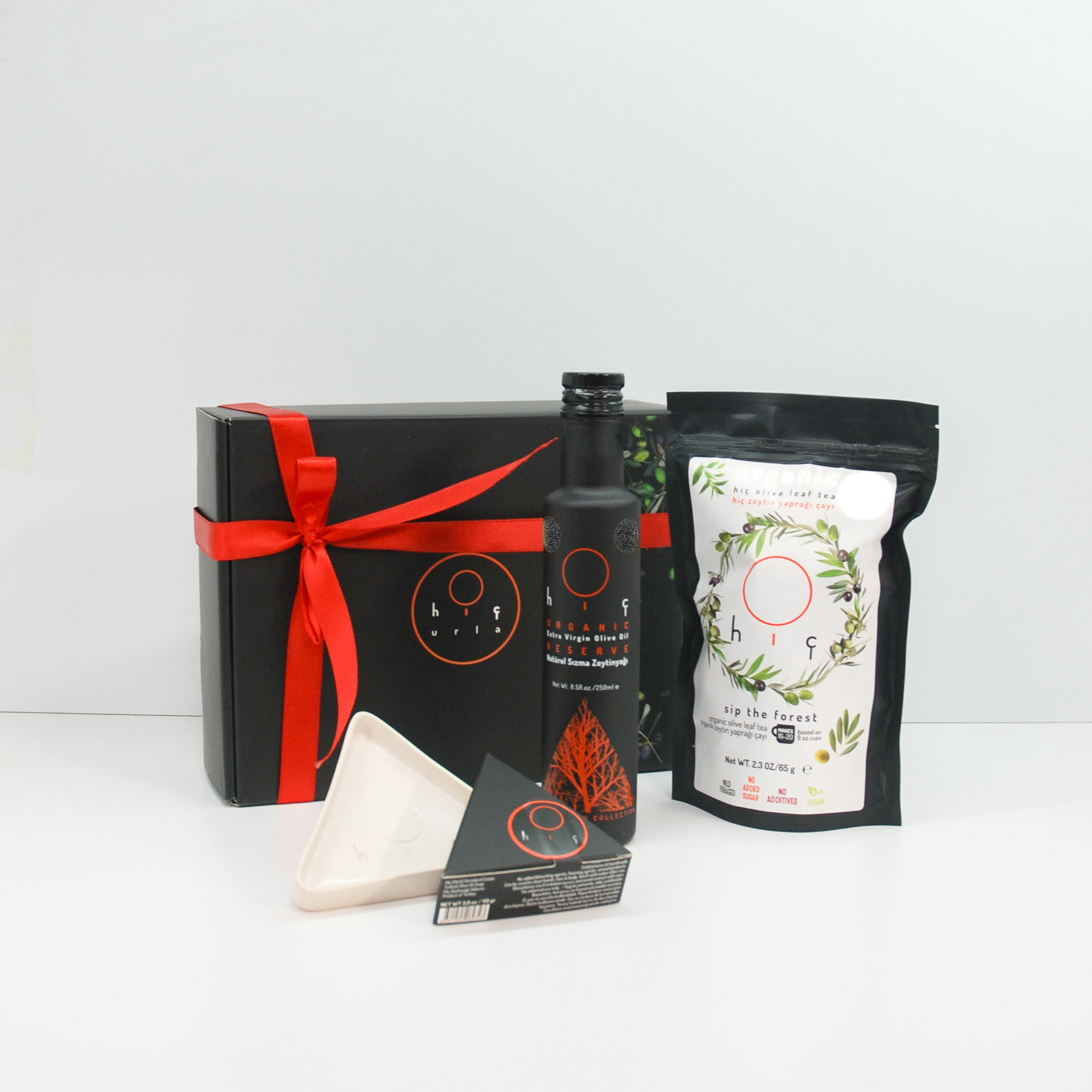 Özenle paketlemiş Hiç Zeytin Ormanı’nın en gözde ürünleri ve kendi üretimimiz seramik koleksiyonumuzu yansıtan çok özel bir hediye paketi: